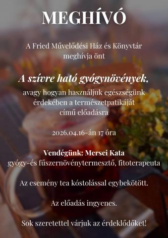 A szívre ható gyógynövények címmel tart előadást intézményünkben Mersei Kata gyógy- és fűszernövénytermesztő, fitoterapeuta. Szeretettel várunk mindenkit!