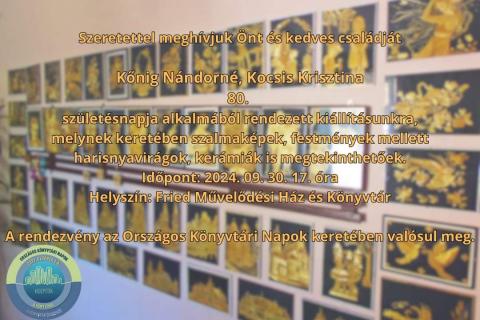 Kőnig Nándorné, Krisztina simontornyai alkotó 80. születésnapja alaklmából kiállítás nyílt a munkáiból, melynek keretében szalmaképek, festmények mellett harisnyavirágo és kerámiák is megtekintetők.