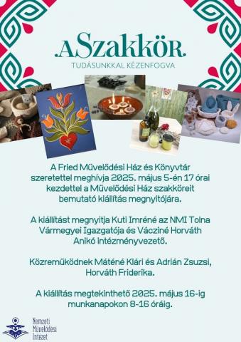 Szakköri tagjaink az év során 20-20 alkalommal dolgoztak a kiállított darabokon. Gyertyaöntés, baba-mama horgolás, zsínórfonallal horgolás, naturkozmetika és bútorfestés szakkörökön 5-5 fő vett rész. Az elkészült gyönyörű darabbokhoz az anyagot a Nemzeti Művelődési Intézet biztosította. A munkákból május 5-én nyílt kiállítás.